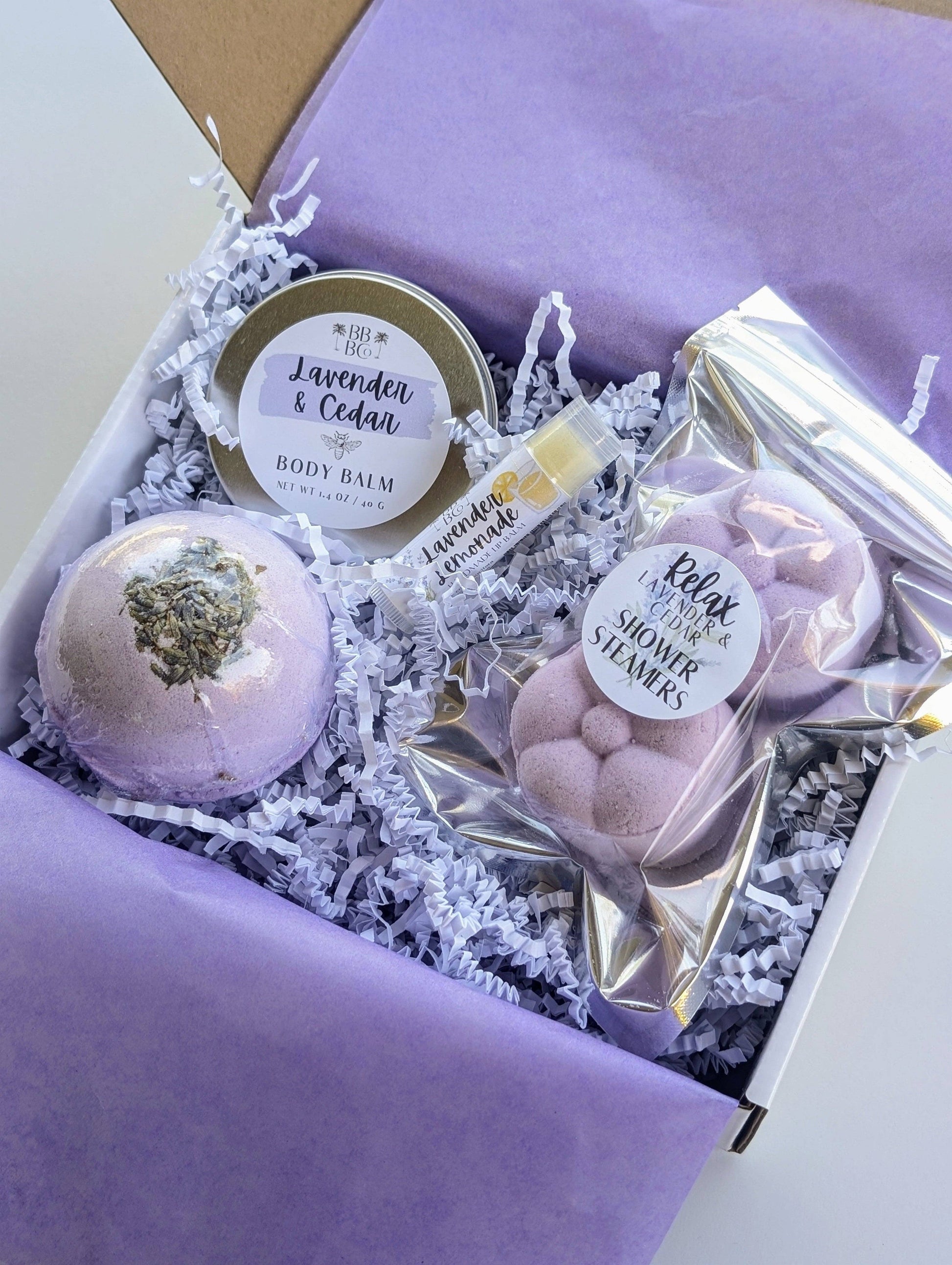 Our Lavender & Cedar gift set is relaxation in a box! Soothing lavender and earthy cedarwood combine beautifully in one of our most relaxing scents. Includes our Lavender & Cedar body balm, our "Relax" lavender shower steamers, a Lavender & Cedar bath bomb topped with real lavender buds, and a Lavender Lemonade shea butter lip balm for a super smooth pout. A perfect gift for those who want to unwind. Ready to gift in a white gift box with matching purple tissue paper. A perfect Mother's Day gift or an everyday gift for her.